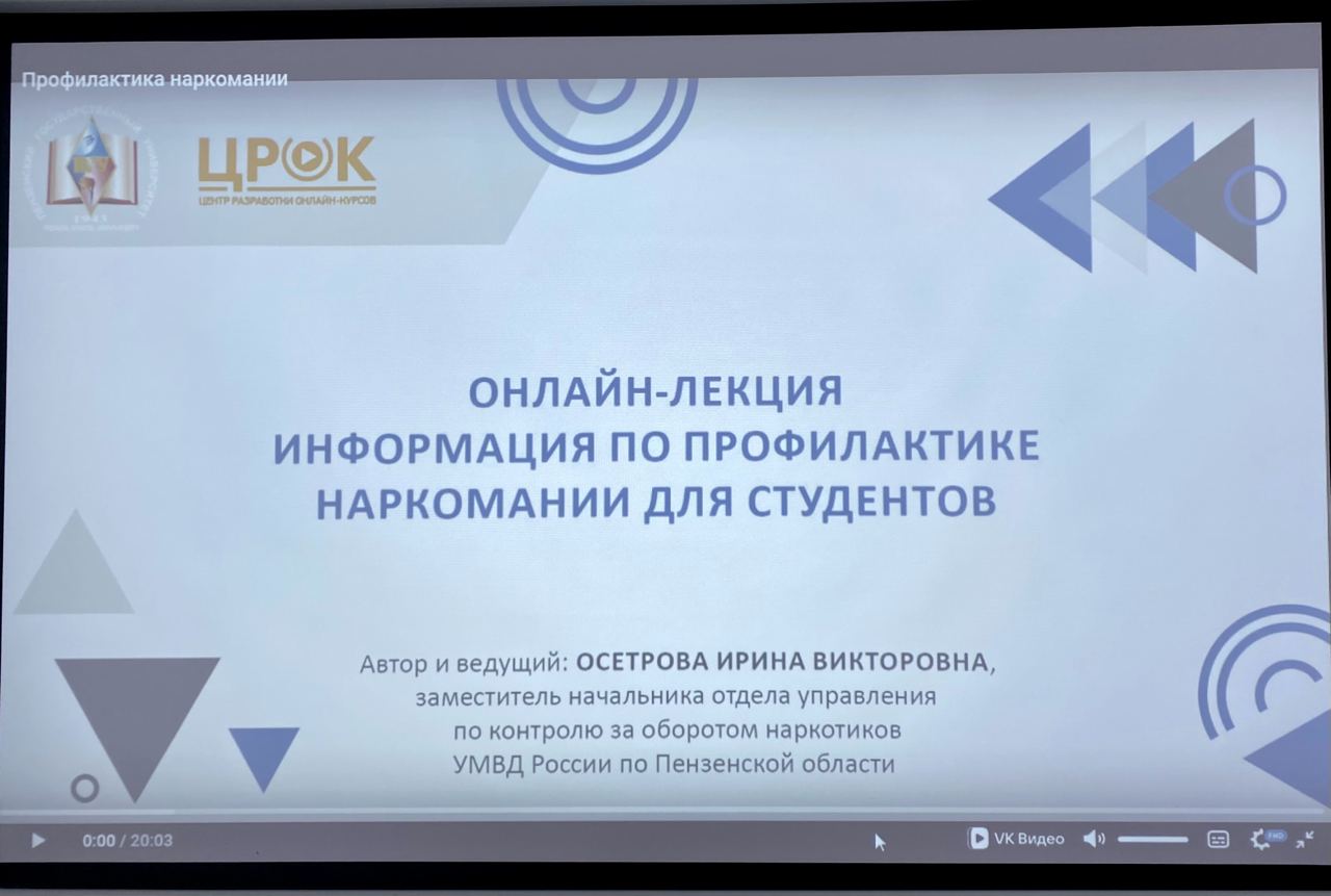2 октября 2023 года на кураторском часе для студентов первого курса кафедры "Информационная безопасность систем и технологий" была проведена профилактическая беседа о вреде, который может быть причинен при употреблении наркотических средств, а также об уголовной ответственности за незаконный сбыт наркотических средств. Была прослушана лекция Осетровой Ирины Викторовны, заместителя начальника отдела управления по контролю за оборотом наркотиков УМВД России по Пензенской области.