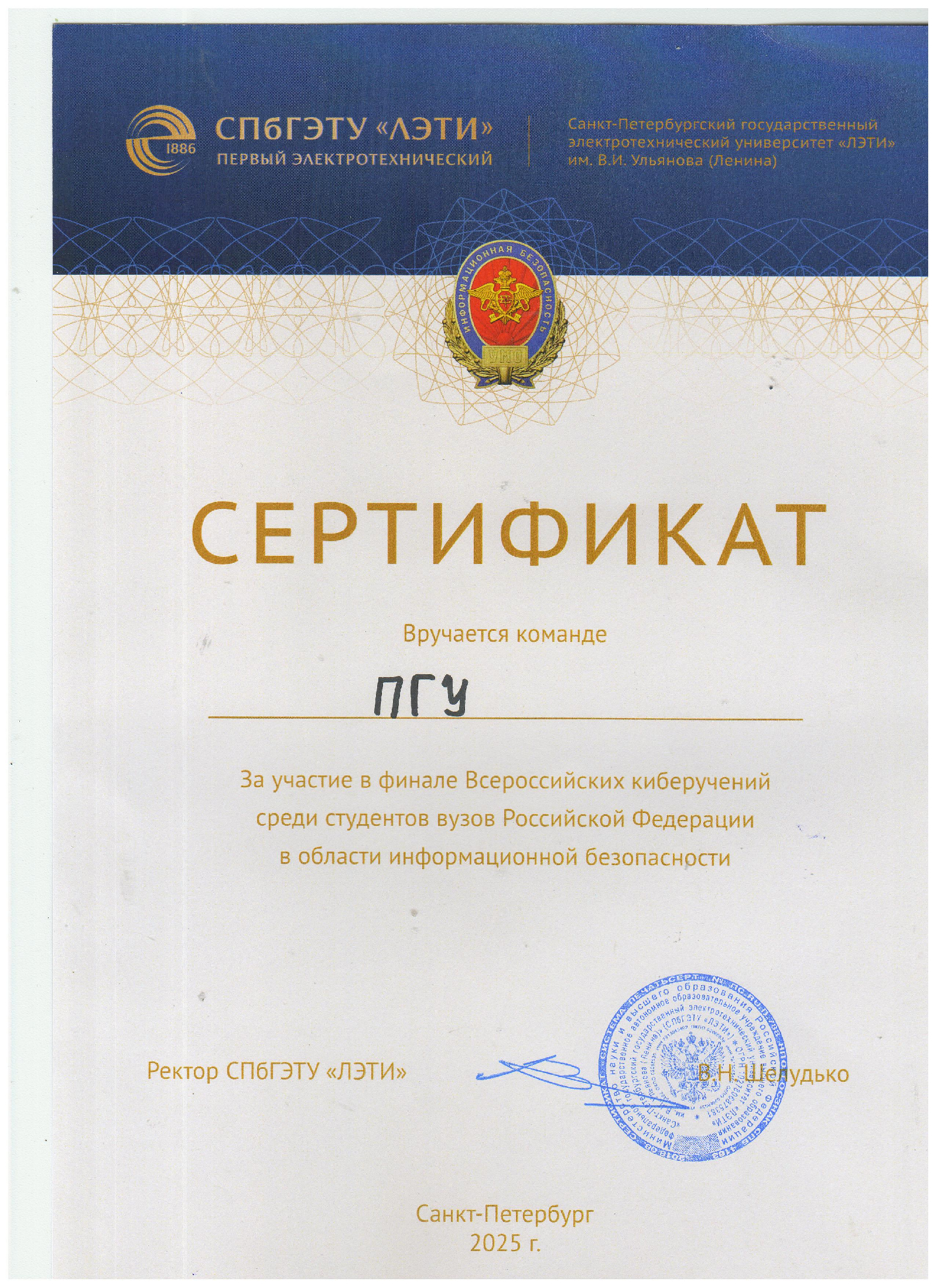 Студенты группы 21ПТ1 Евгений Нафтаев, Алесандр Рогашевский и Вадим Шепталин представляли команду ПГУ в финале олимпиады "Всероссийские Киберучения 2025", проходившей в Санкт-Петербурге 5-6 октября 2025 г.